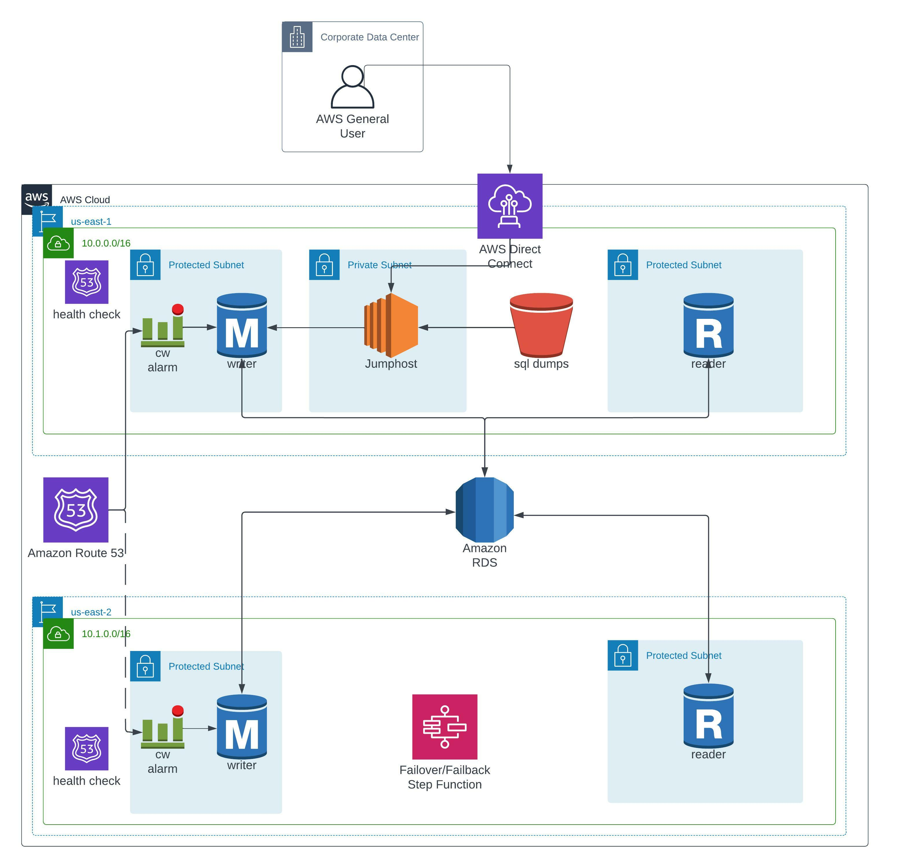 One difficulty in using Aurora Global Database is dealing with DNS resolution at a global level. The service only comes with regional writer/reader endpoints. Our customer had a specific requirement that they not have application code changes when a failover occurs. This meant that we had to design a custom solution to handle both managed and unplanned failovers and keep applications running seamlessly. We were able to achieve this using Route53 and Step Functions. You can take a look at how Route53 is set up by referencing the architecture image at the top of the post.