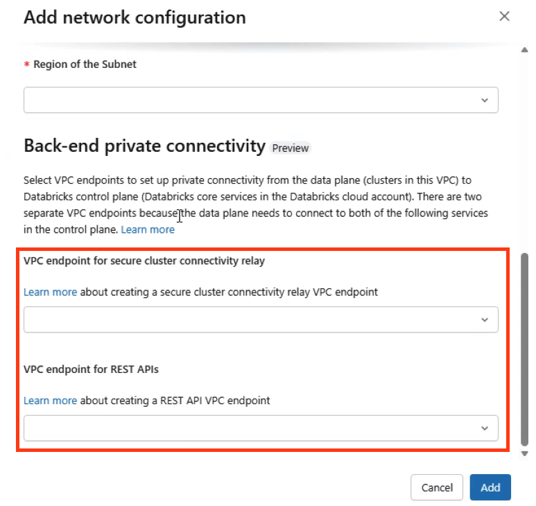 Prerequisite: Provision a customer-managed VPC in the same region as the Databricks workspace. PSC requires a customer-managed VPC and must be configured at workspace creation time. It cannot be added later or enabled on a Databricks-managed VPC.
